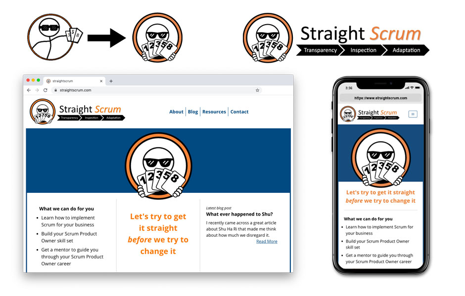 I worked with a fantastic BSA back at ING, and was thrilled when I got a message from him saying he was starting his own business and needed some help with the branding. I already knew we worked really well together, and (organized as always), he already had a name and deck of concepts to show me. I took his original idea of a person holding a fan of Scrum cards and refined over a few rounds. "The Dude" got a new pair of sunglasses, the cards got larger so they were readable, and adding some little fingers that break out of the circle completed the composition.